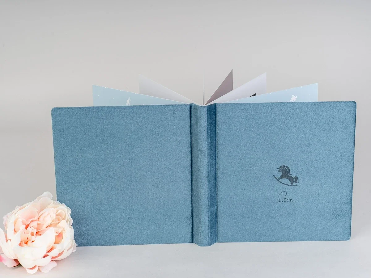 Zowel het album als het miniboekje zijn verkrijgbaar in de kleuren soft pink roze, aquamarine blue of ecru beige met op de voorkant de naam van jullie kindje.